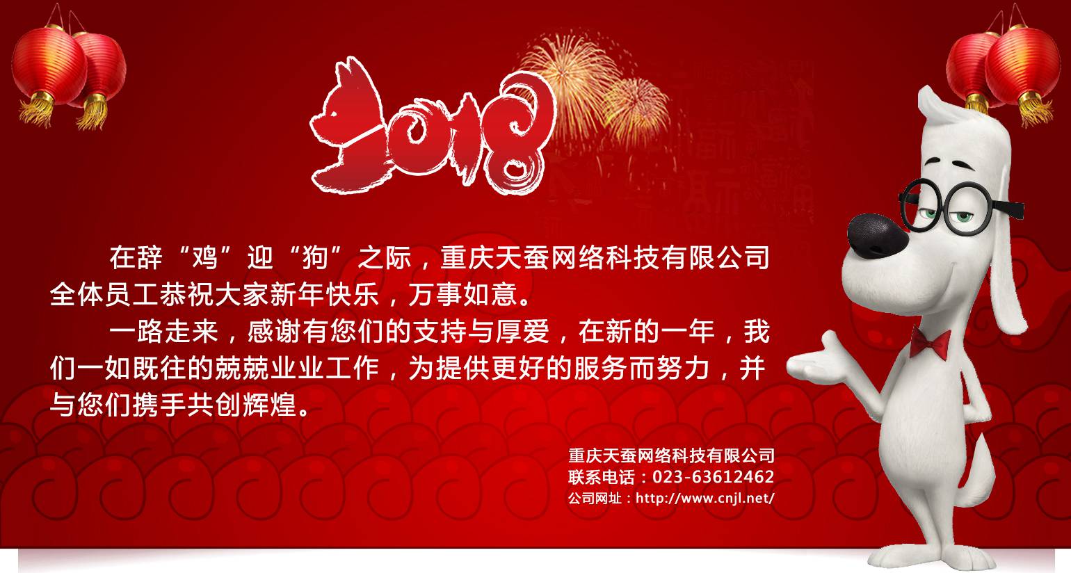 二、在2018年春節(jié)長(zhǎng)假到來(lái)之際,感謝大家支持和厚愛(ài),在此重慶天蠶網(wǎng)絡(luò)科技有限公司的全體員工向您們致以節(jié)日的問(wèn)候,祝您們新年快樂(lè),生意興隆,家庭幸福。